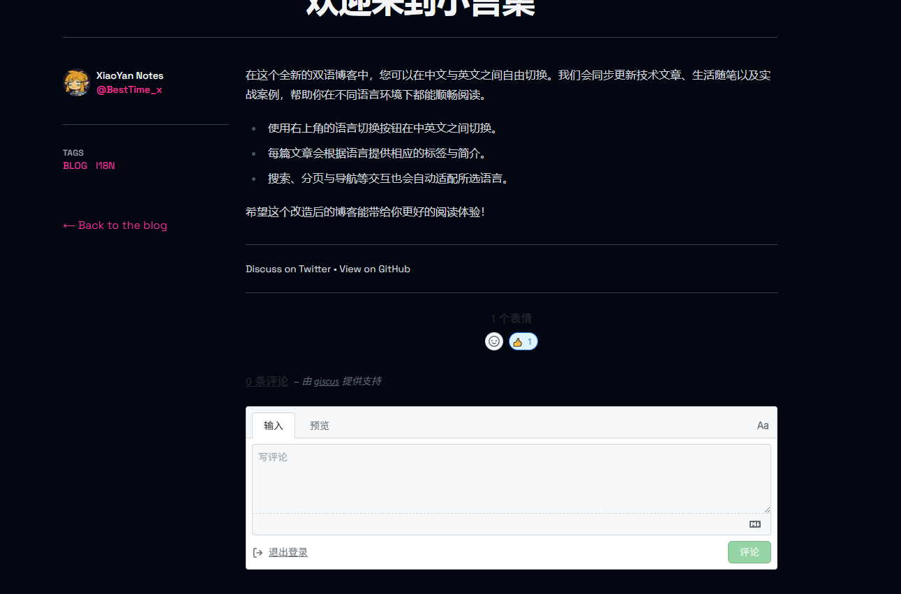 部署后,访客即可使用 GitHub 账号在博客下方评论互动。