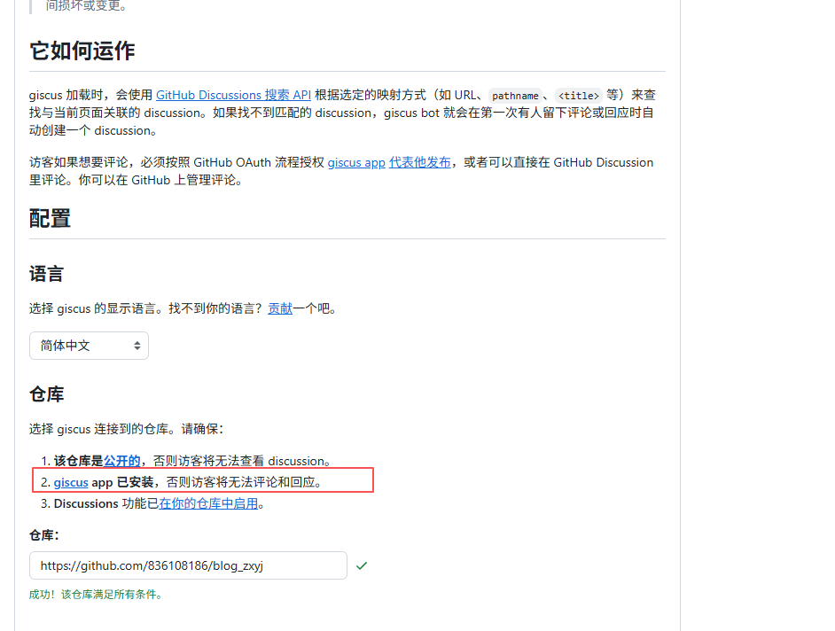 | 显示提示“giscus app 未安装” | 没有给目标仓库安装 Giscus App | 按上面第一步安装 |